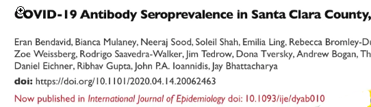 Volgens de WHO was de mortaliteit 3,4% van alle besmettingen. Maar dat geloofden de auteurs uiteraard niet en ze deden dus hun eigen studie. Ze deden dat in Santa Clara County (California, USA).