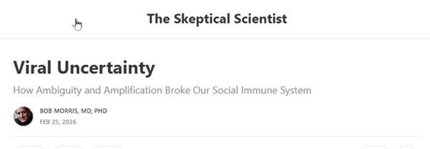 De titel vertolkt het gevoel van onzekerheid, twijfel en angst dat heerste tijdens de eerste fase van de Covid-pandemie (2019-2020). Het is gebaseerd op een schitterend artikel van collega -skeptical medical scientist- Bob Morris (https://drbobmorris.substack.com/p/viral-uncertainty?r=c5emj)