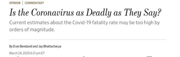 Toen verscheen ook het bewuste (en beruchte) artikel in de Wall Street Journal van o.a. Ian Bendavid en Jay Bhattacharya op 24 maart 2020 waarin ze hun twijfels rond de “dodelijkheid” van Covid ventileerden.