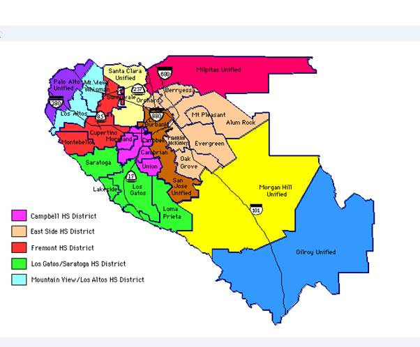 Toevallig ken ik deze regio een beetje (vooral het noordwestelijke deel van “Silicon Valley” met Stanford,Cupertino, Palo Alto, Los Altos, Los Gatos, Saratoga, Burbank, Mountain View, Milpitas etc..tot aan Gilroy). Het is een county die bestaat uit diverse districten (cf. kaart) en dens bevolkt is (ongeveer 2 miljoen bewoners). San José is er de hoofdstad.
