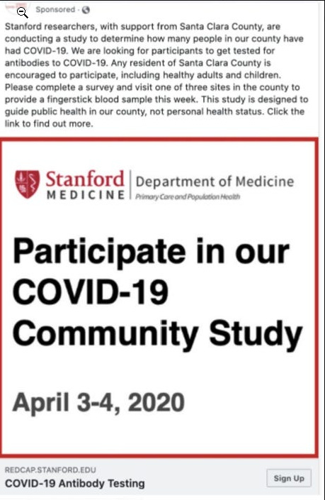De auteurs gaven aan dat er een bloedtest gebeurde bij +/- 3300 van de 4250 geregistreerde personen en dat er binnen de 24 h na het verschijnen ongeveer 11.000 kliks waren op de annonce. Bij FB weet men dat er ongeveer 3% van alle mensen die ene annonce bekijken er ook op klikken. Men kan dus vrij veiligstellen dat er ongeveer 11.000 (3%) vertegenwoordigt, er 366.000 mensen dit bekeken, maar finaal slechts 3.300 (0,9%) actief participeerden. En op de totale populatie van de county ( 0,16%)